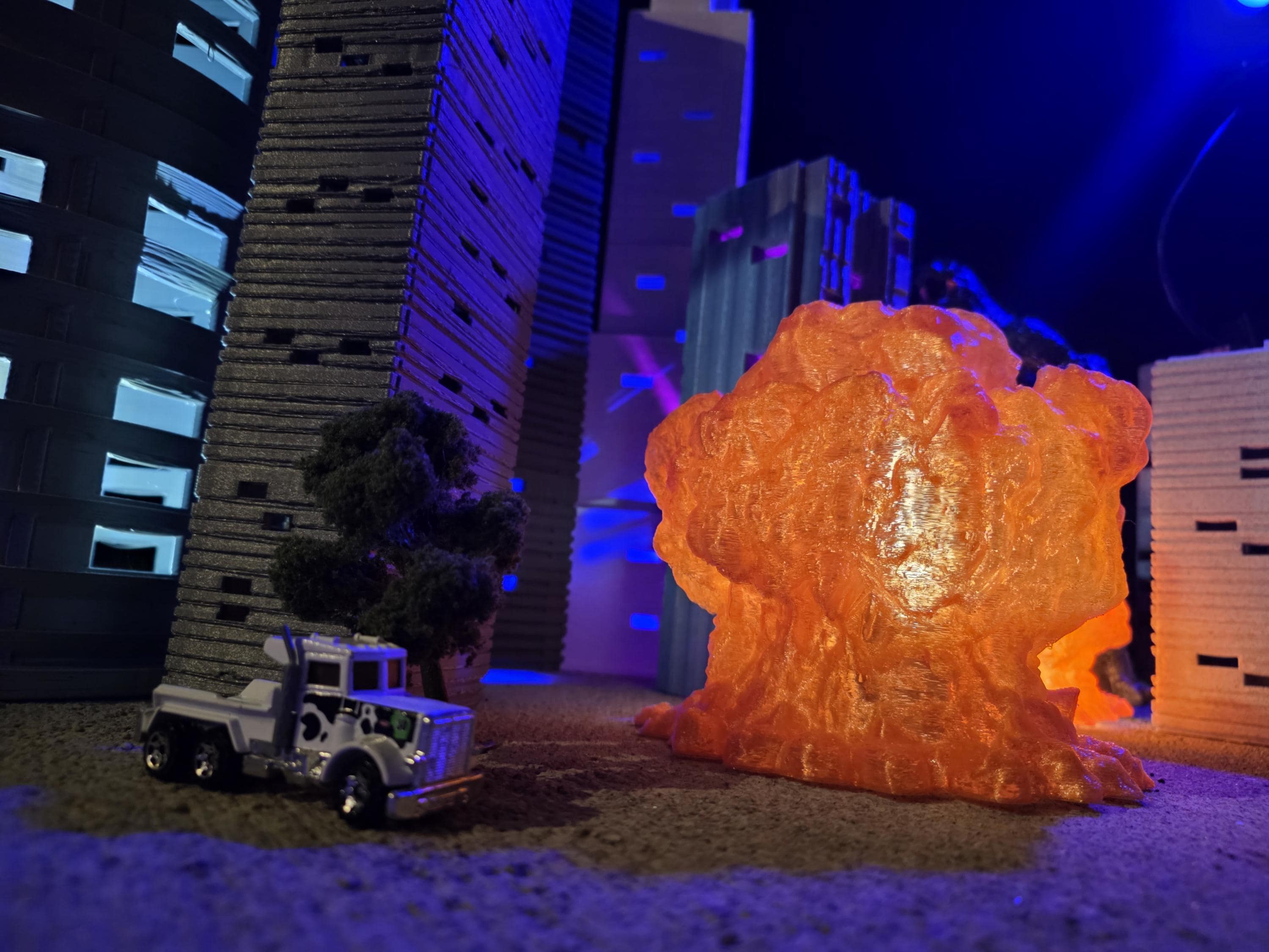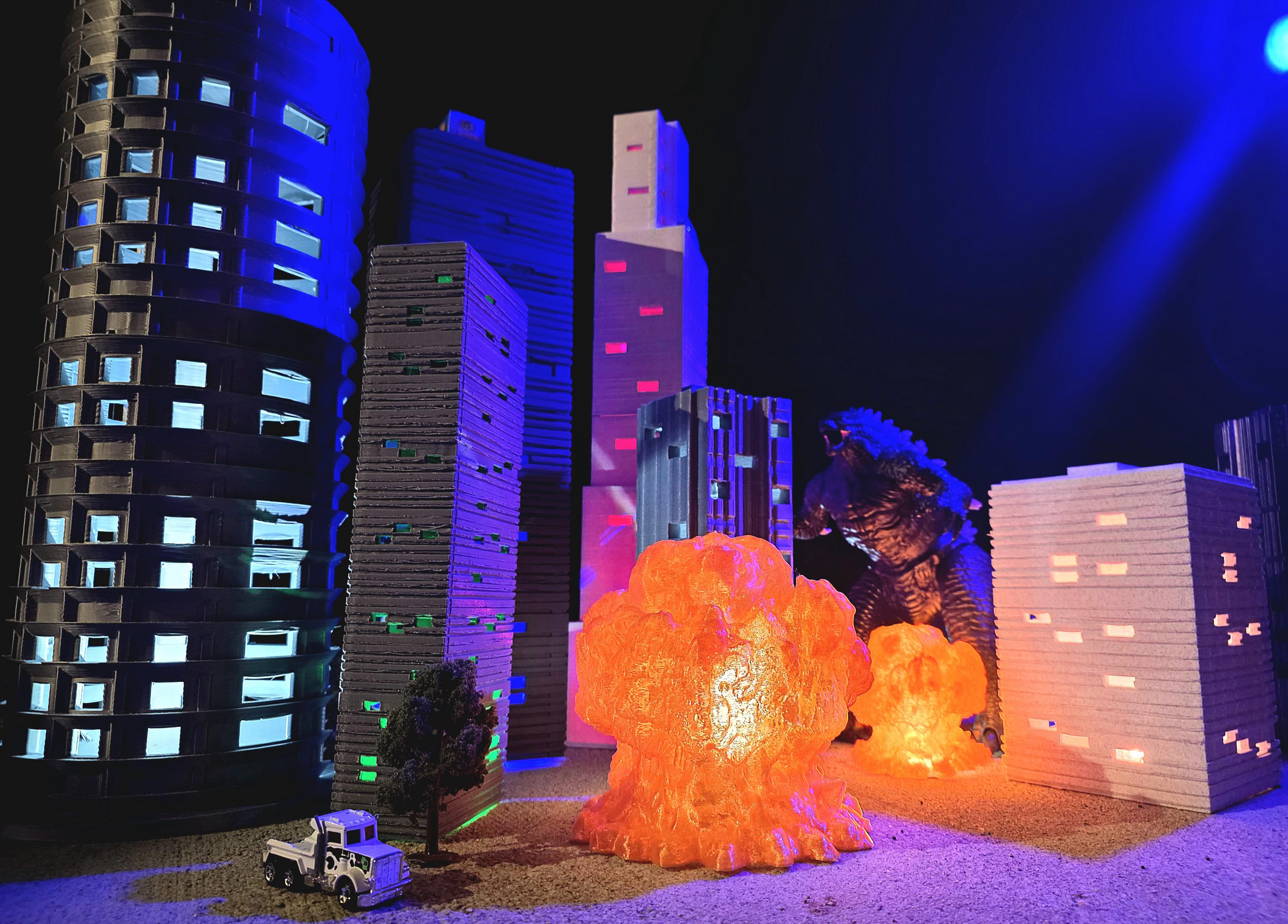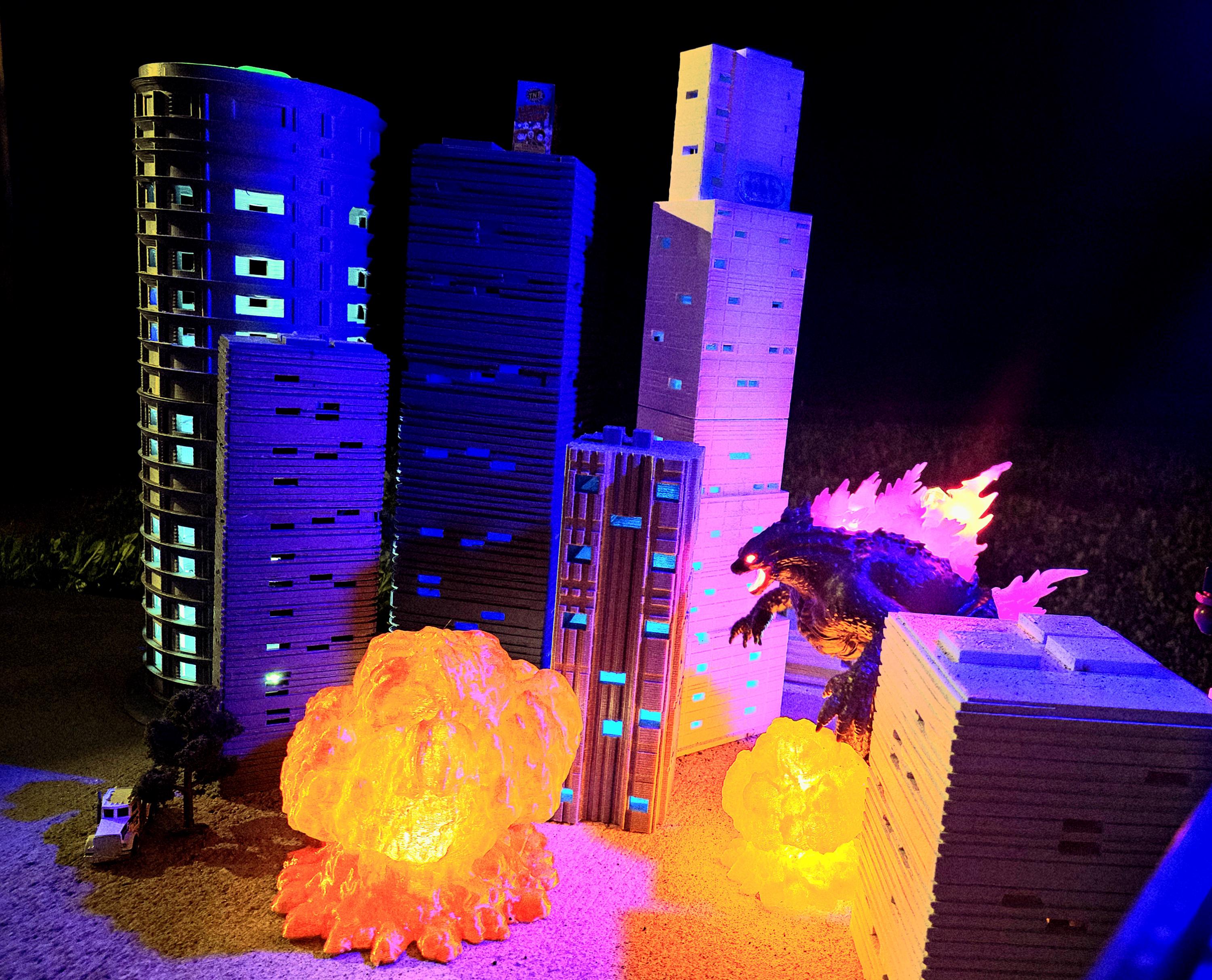 XXL Miniature 3D Printed City Set – 6 Buildings + 2 Explosion Props with Rechargeable Lights – S Scale - Toy Photography Prop - Godzilla
